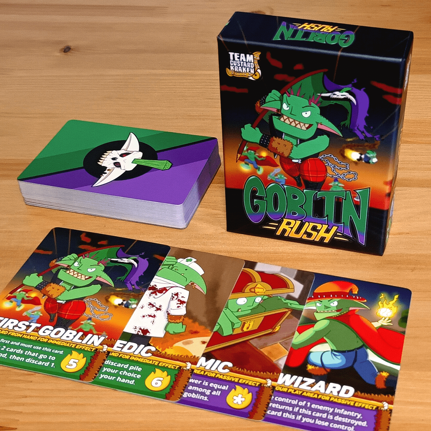 Goblin Rush is a two player, take-that battle card game that introduces a refreshing take on the classic 21 format. Draw cards from a shared supply and use Infantry or Leader goblins to take control of the battlefield and assert your tactical dominance.